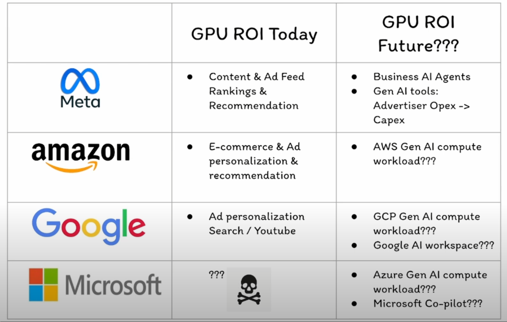 I’ve long argued that Meta occupies a privileged position because the bulk of its core revenue engine directly benefits from incremental GPU spending via recommender-system improvements. This fungibility of GPU utilization reduces the risk of over-investment and creates attractive optionality for future AI workloads.