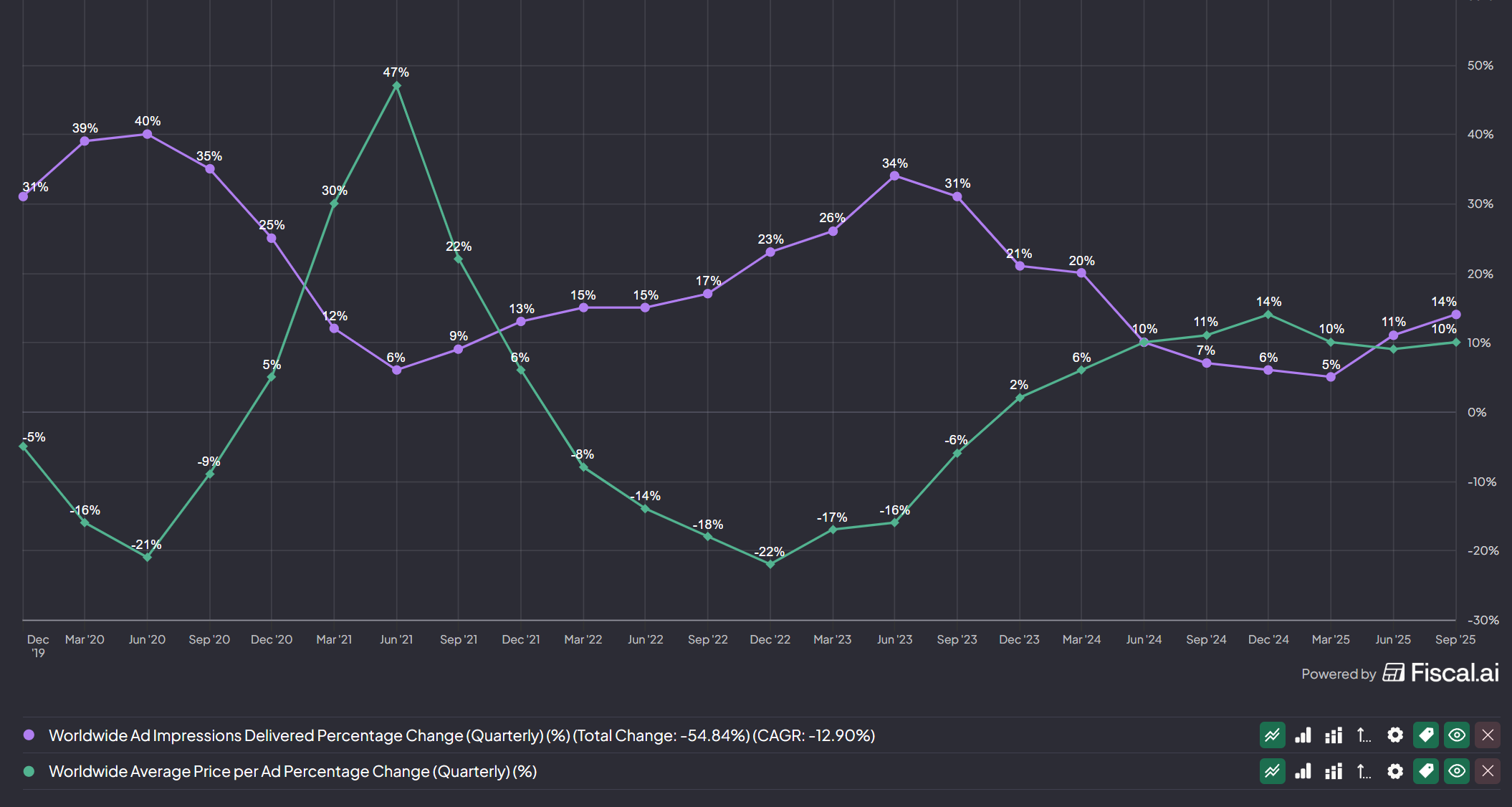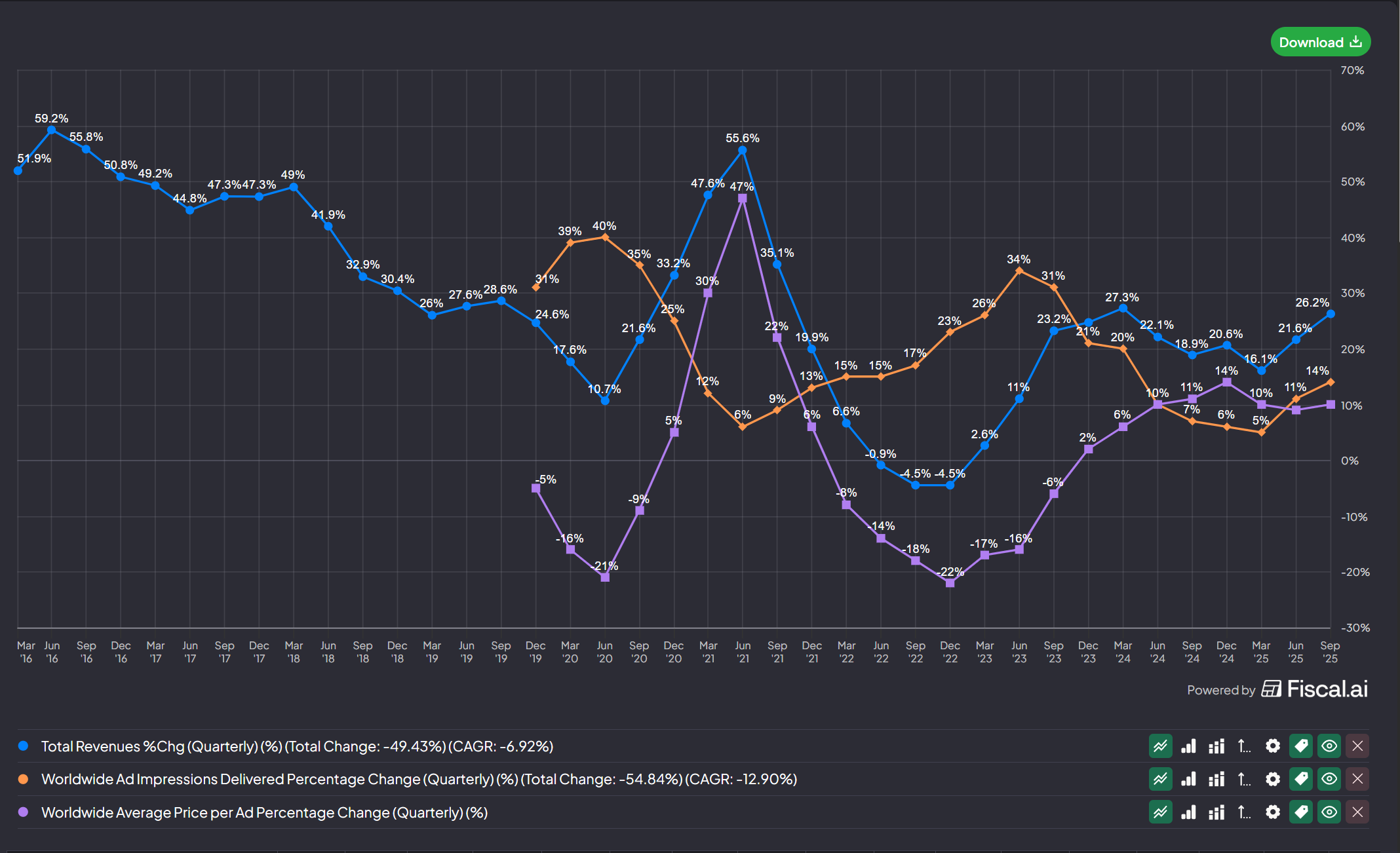 - When both lines go up, it signifies improved efficiencies in ad recommendation systems, resulting in an acceleration in revenues to +26.2% YoY as seen below (blue line)