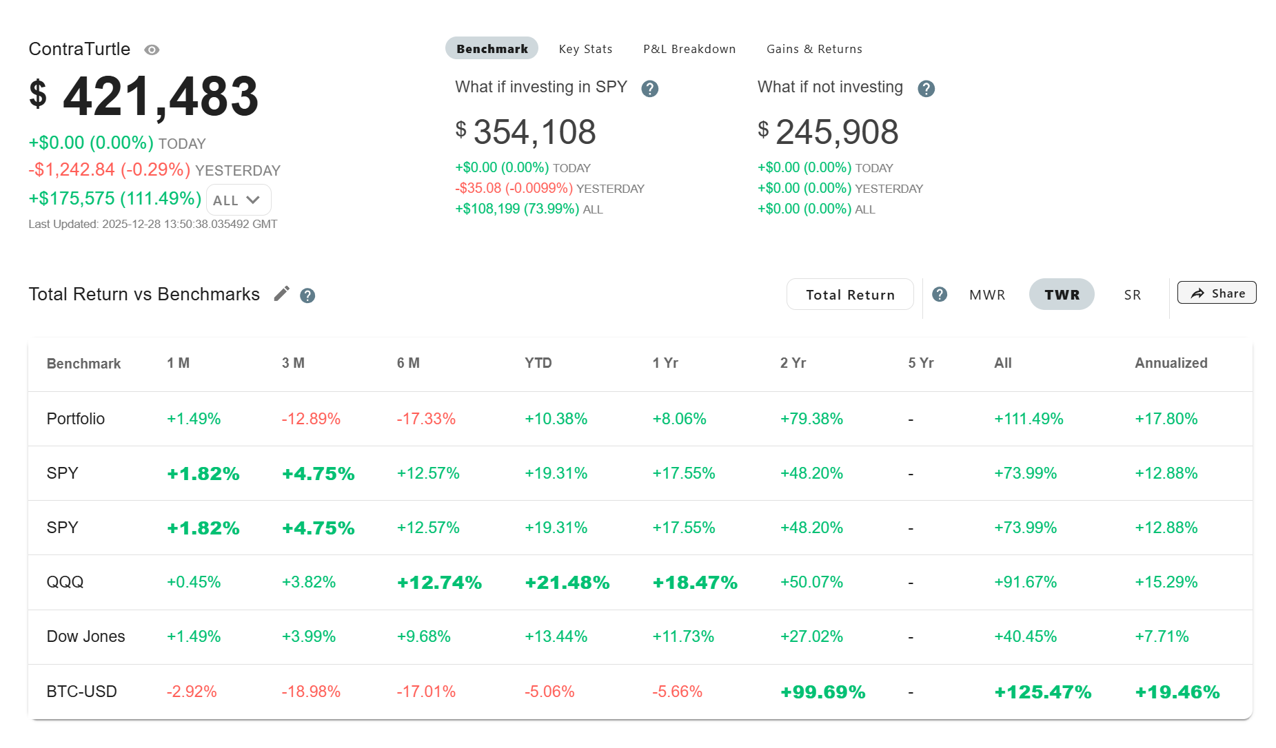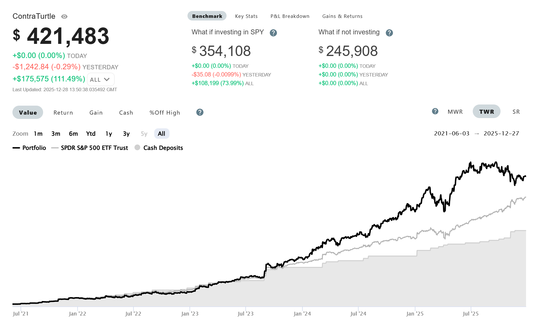 Over 4.5 years, the portfolio (17.8%) has outperformed the S&P500 by 5% on a Time-Weighted annualized return basis. Portfolio performance is never a straight line upwards, especially when my holdings differ so greatly from the index.