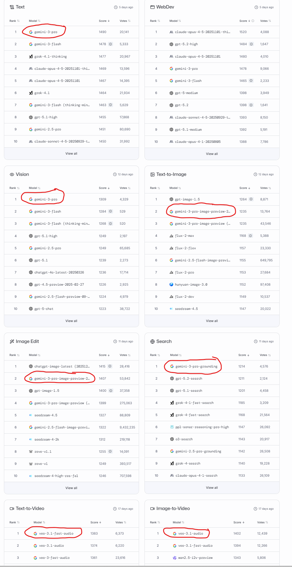 Once a 'laggard' in Generative AI, Google's Gemini models now top the charts across most use cases on lmarena's leaderboard, except coding which are usually led by Anthropic Claude or GPT models.