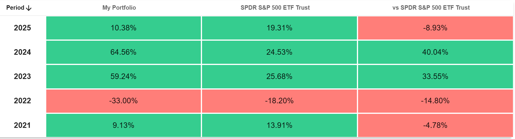 As a long-term investor, I expect periods of underperformance relative to the market in some years, such as 2022 and 2025 for myself, and outperformance in others, such as 2023 and 2024 (see table below). In fact, I tend to embrace underperforming years as they are usually opportunities to top-up on my high conviction stocks.