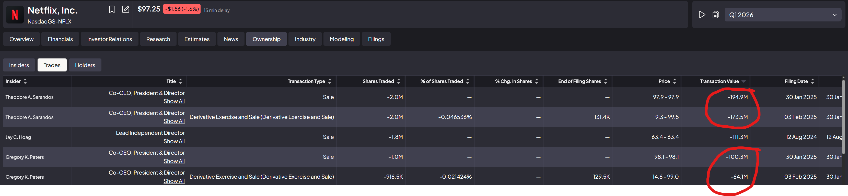 Here is what I don't love. Sarandos and Peters both sold heavily in early 2025, near what turned out to be near-ATH levels. Sarandos offloaded roughly US$195M in a straight sale and another ~US$174M via derivative exercise-and-sale in Jan/Feb 2025. Peters sold ~US$100M straight and ~US$64M via derivative exercise-and-sale in the same window.