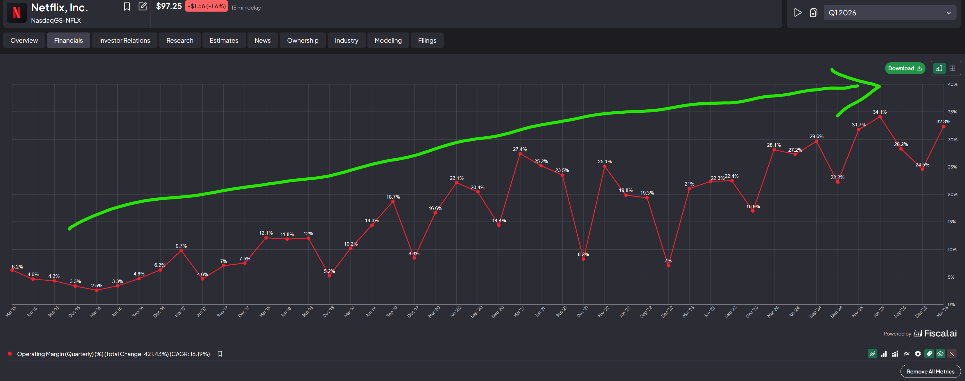 Q1'26 came in at 32.3%, and the 2026 target is 31.5%, up from 29.5% in 2025. Short-term, Q2 will dip to 32.6% vs. 34.1% last year due to the content amortization timing I mentioned above. But if we zoom out, overall direction of the operating margin trend still looks good! So it really depends if investors are in this for the long haul or short-term.