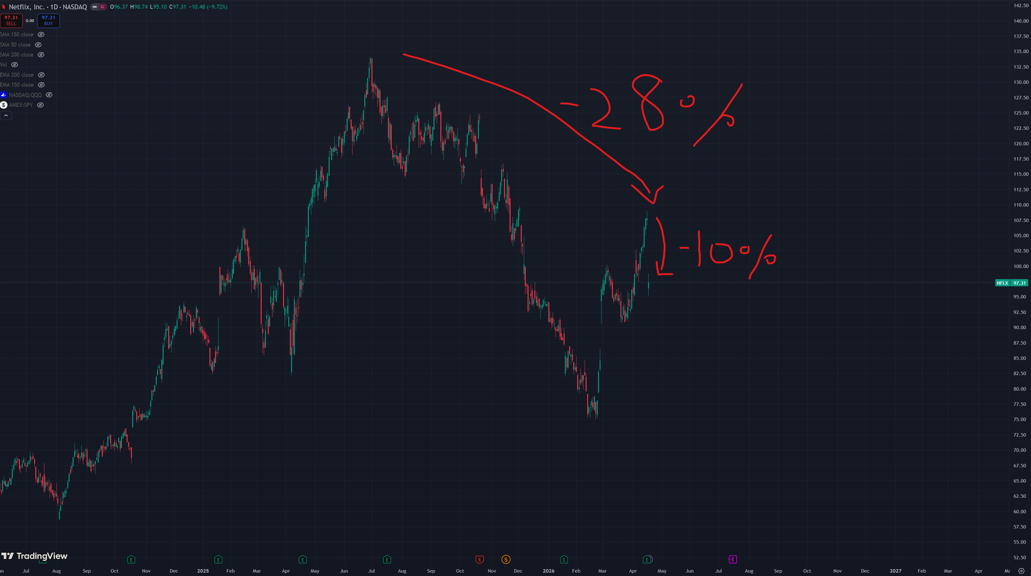 Post Q1 2026 earnings, Netflix stock fell roughly 10% and is still 28% below its 52-week all-time high (see diagram below).