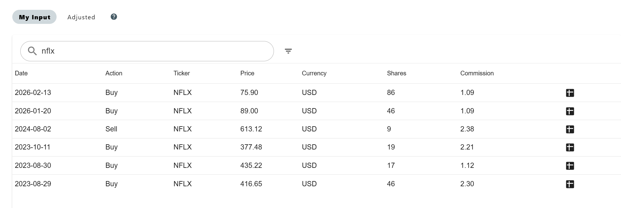 Netflix has been a hugely profitable stock for me. I've not shown this before, but here are my past buy transactions since I began accumulating the stock back in 2023 (note: divide pre-2025 stock prices by 10 to compare against current levels, due to the 10-for-1 split in November 2025):