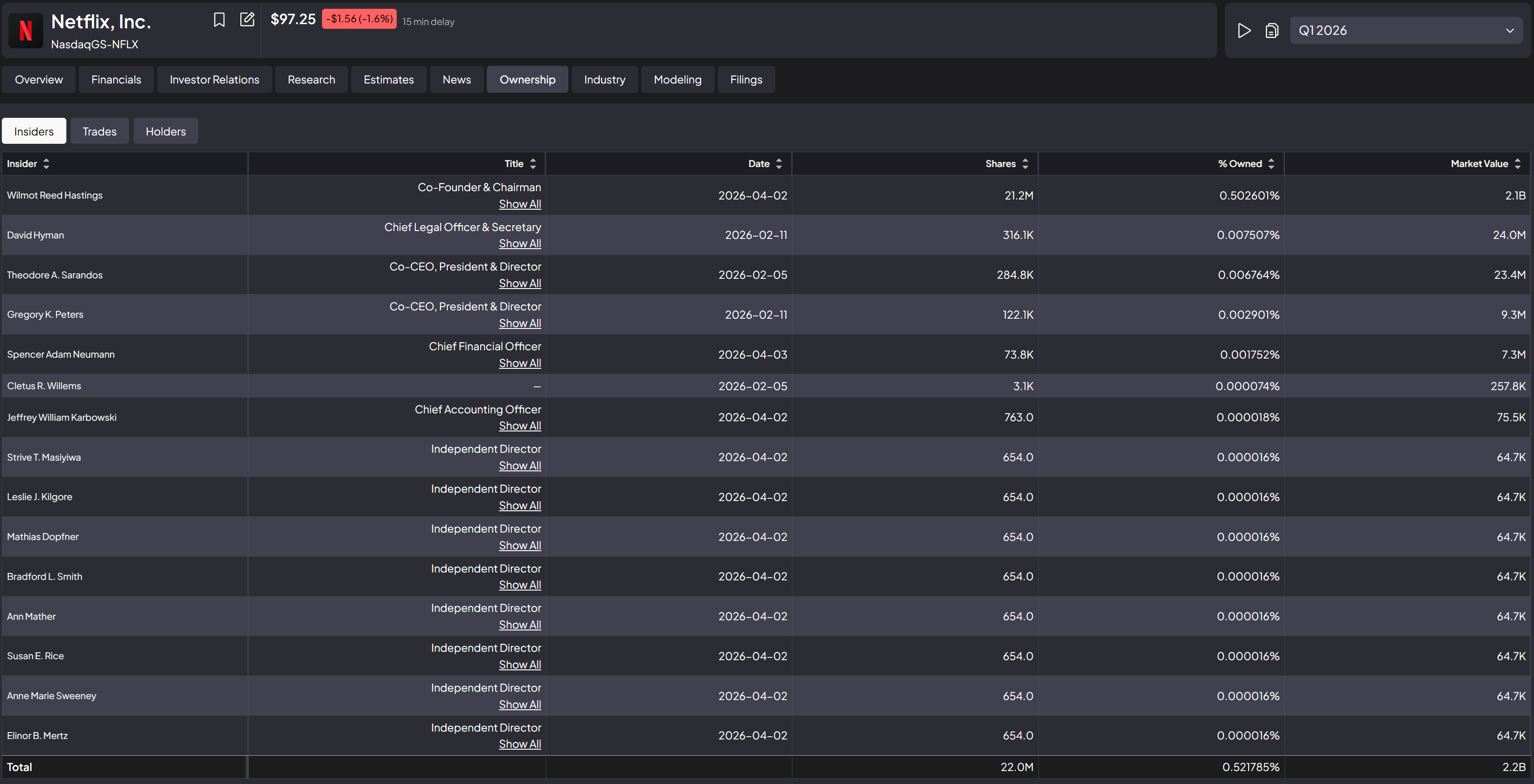 The result: current direct holdings are Sarandos at ~US$23M and Peters at ~US$9M.