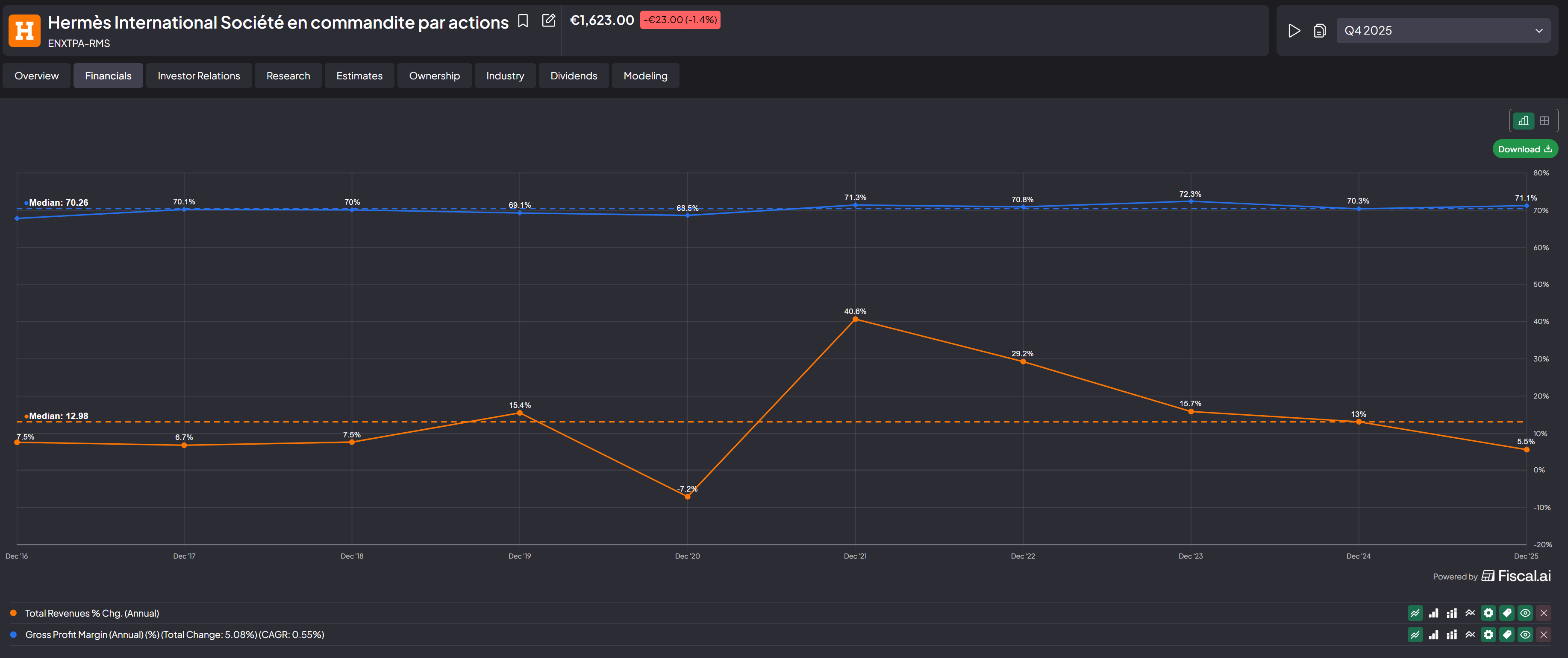 Hermes is growing revenues at a median of ~13% YoY over the last 10 years, about 3% faster than LVMH's ~9.83%. For a company that deliberately constrains its own production to a larger extent, growing faster than LVMH is remarkable.