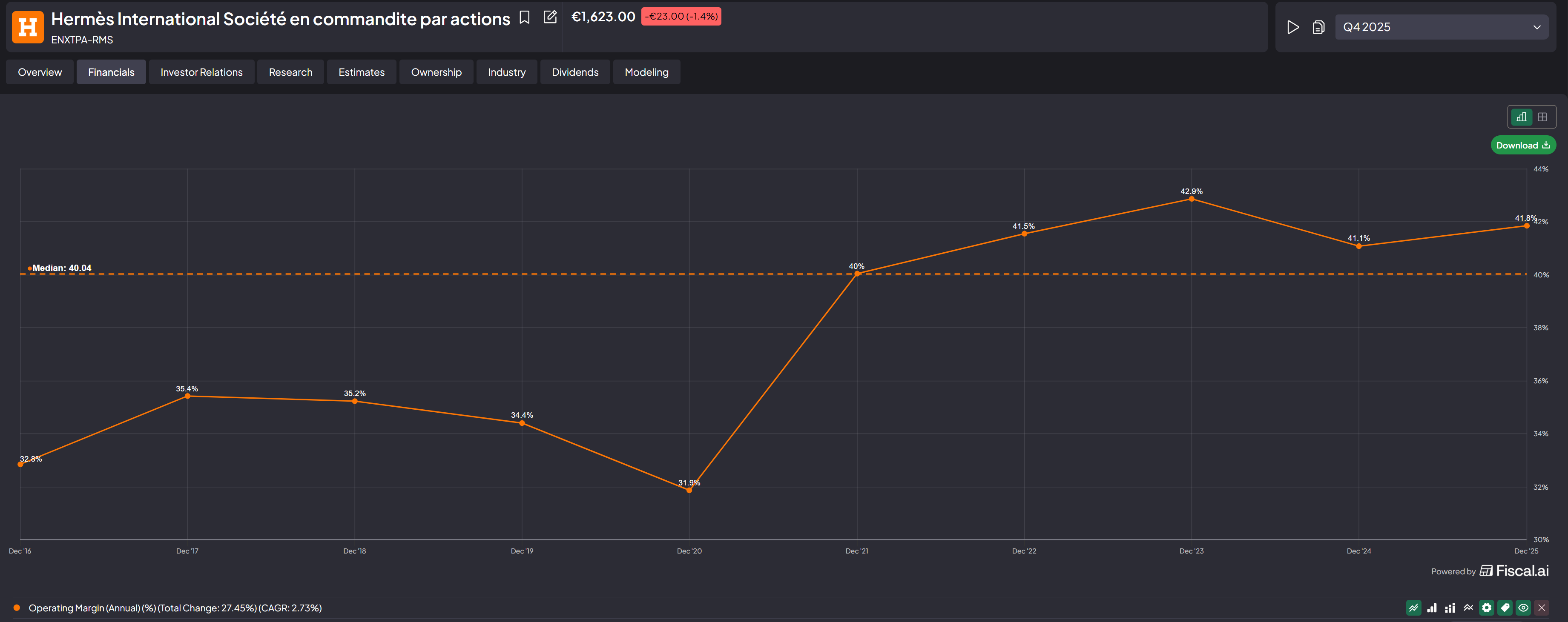 This is where the gap blows open. Hermes is currently doing ~40% in operating margins compared to LVMH's ~21.86%, nearly double its operational efficiency!