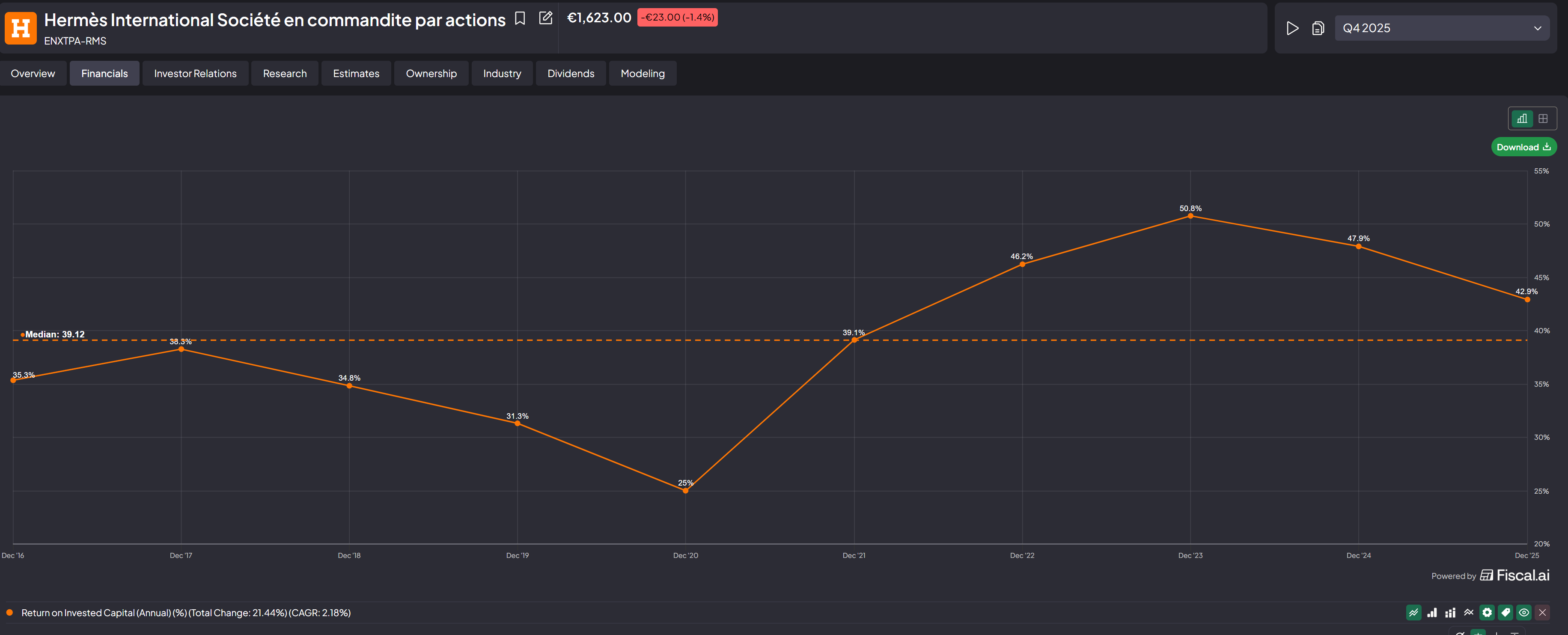 In terms of ROIC, Hermes is at~45.6% vs LVMH ~12%, a 4x difference.