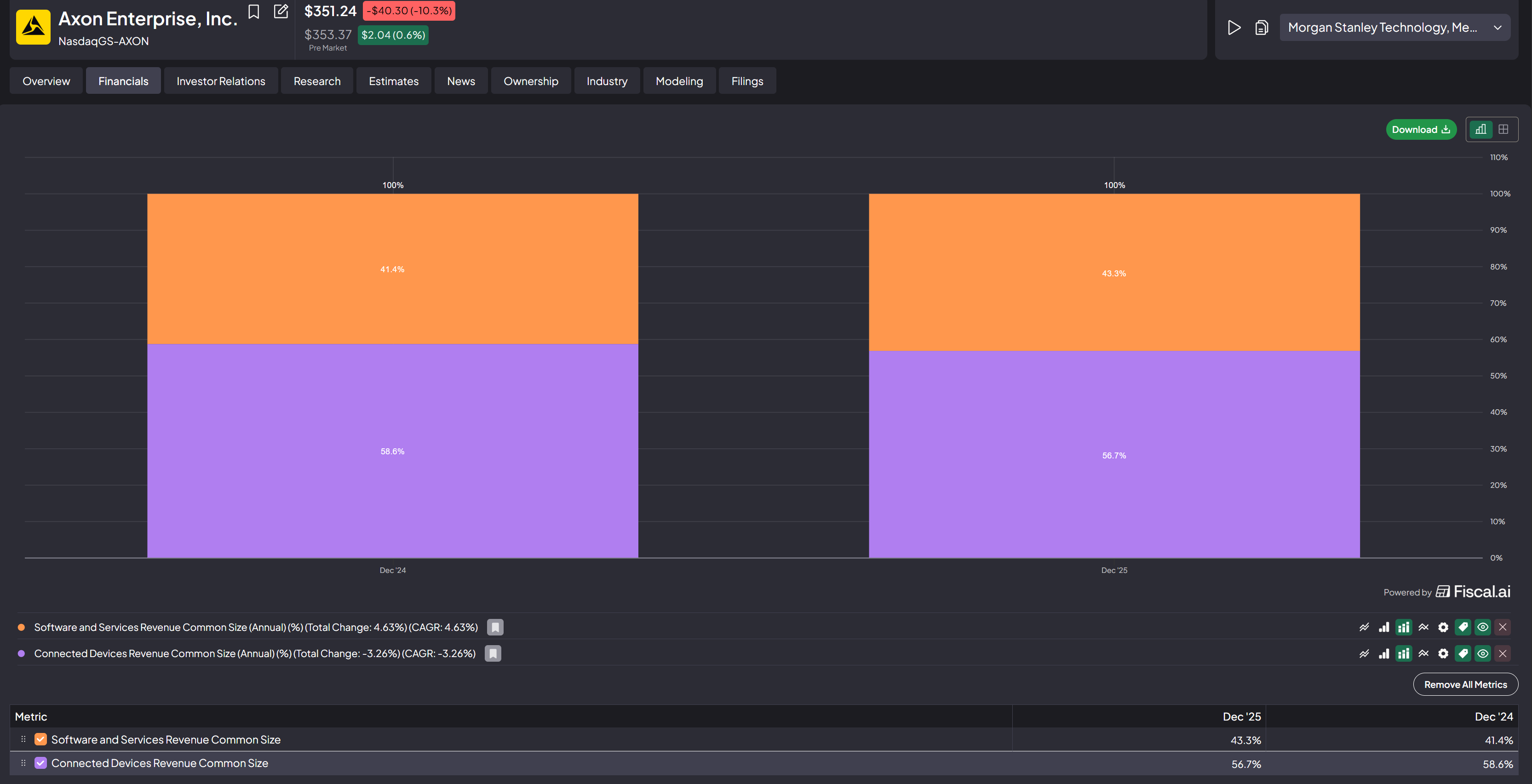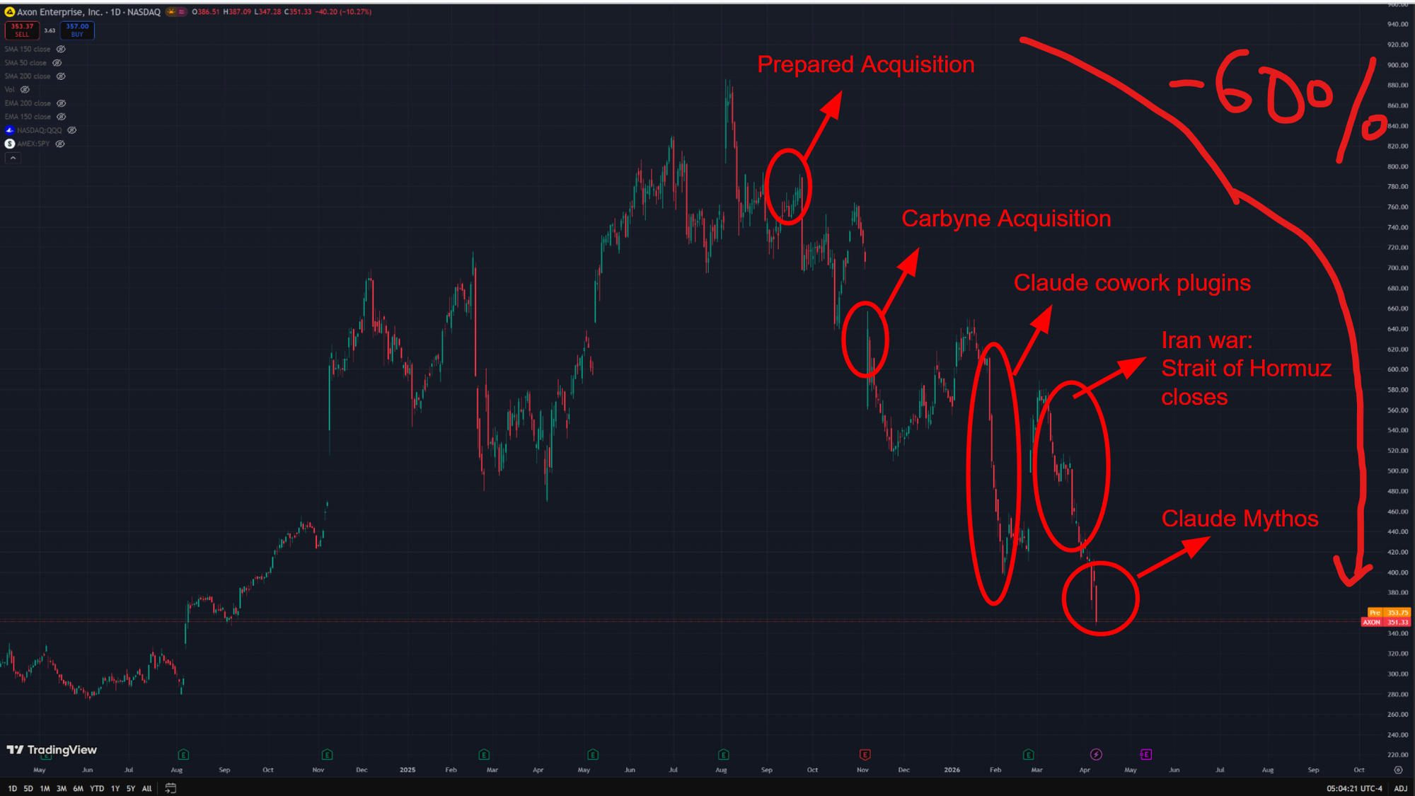 Over the past 8 months, $AXON has fallen ~60% from its all-time high of USD885 in August 2025 to ~USD351 recently.
