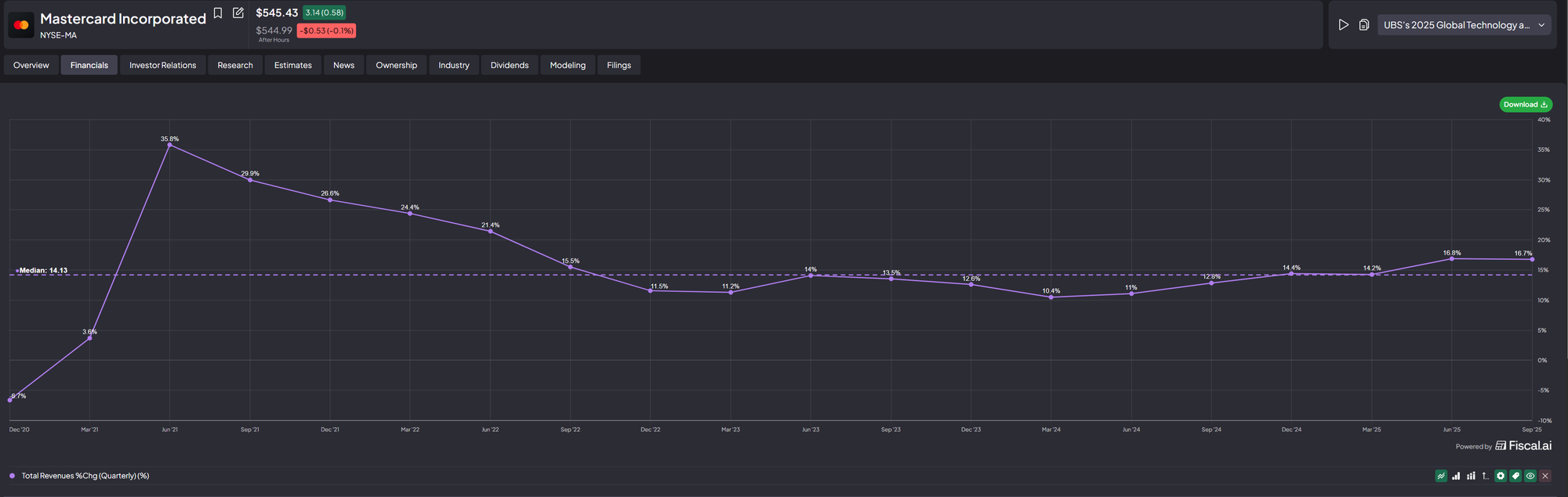 Over the last five years, Mastercard has grown faster than Visa on topline revenues. Using median year-over-year growth across 20 quarters: