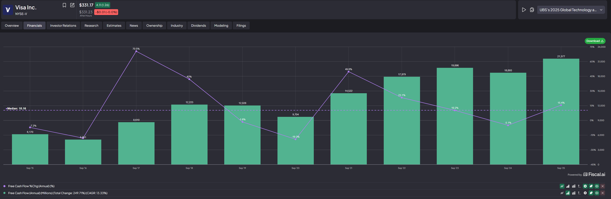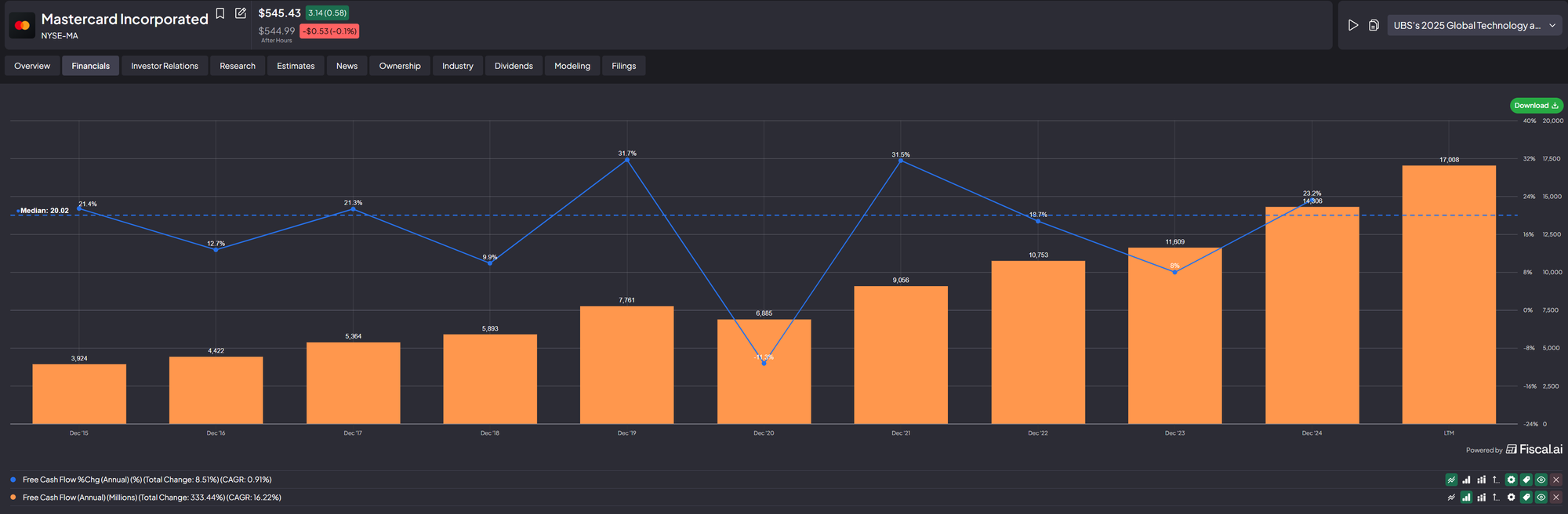This means Mastercard is compounding FCF at roughly 2x the pace of Visa, while also growing top line faster.