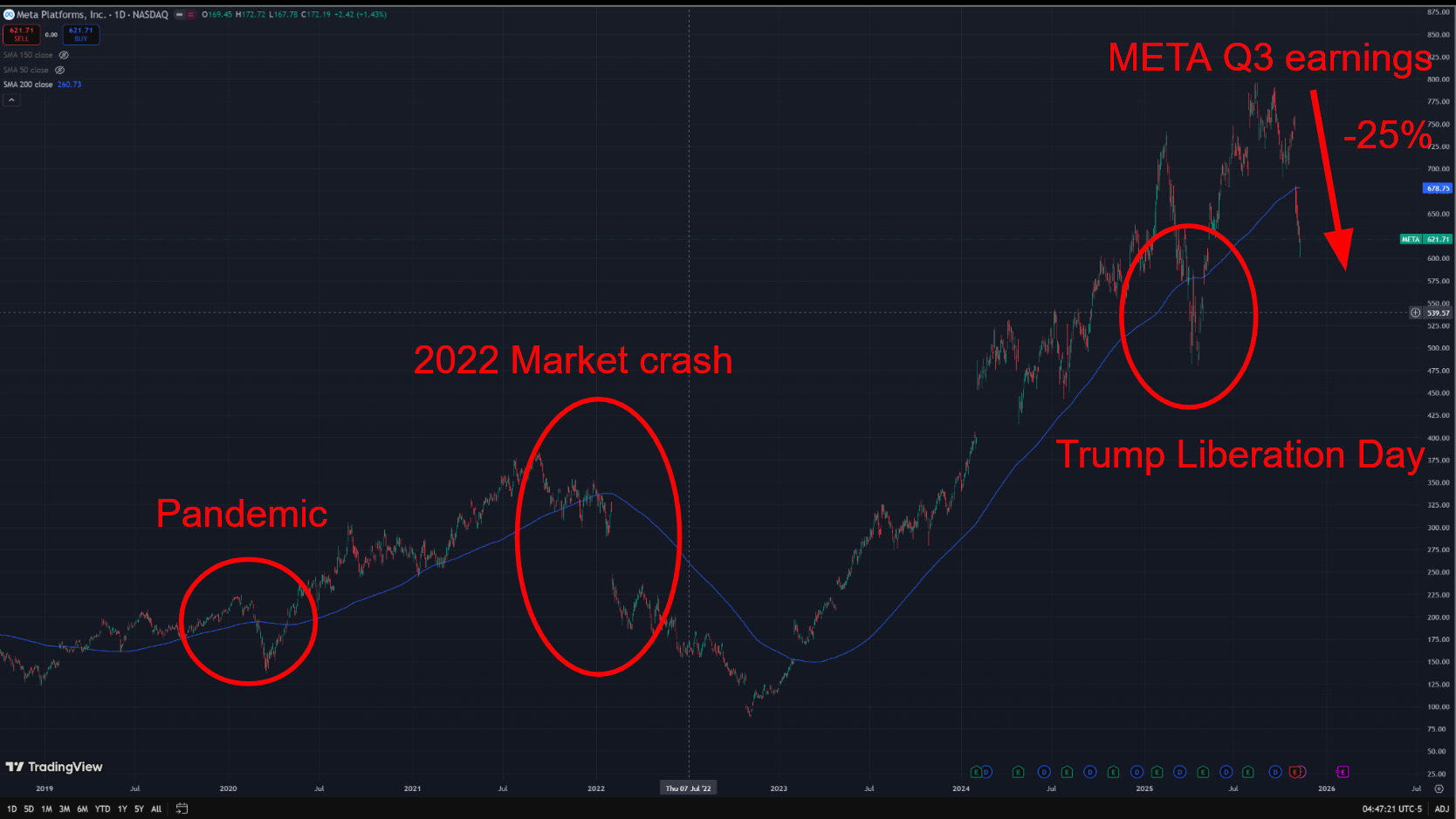 Meta reported its Q3 earnings on 29 October 2025 after market close. The next day, the stock gapped down nearly 9% at open, extending its decline to about 25% below its 52-week highs.