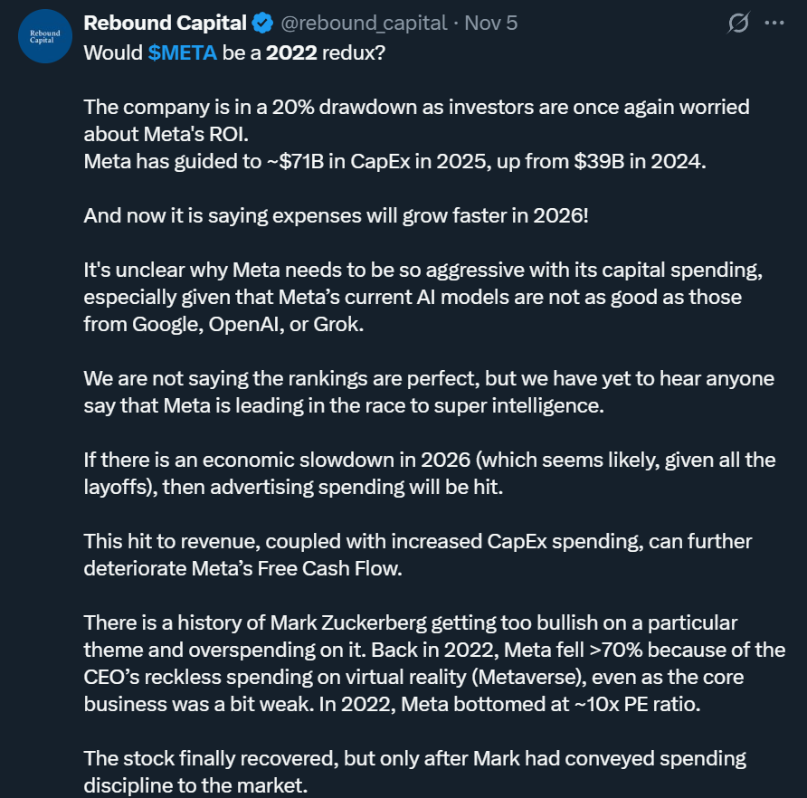 Some of the takes, like below, that I've seen on Fintwit draw parallels to what happened back in 2022, when Meta dipped by ~-80% and there seems to be fear of a repeat: