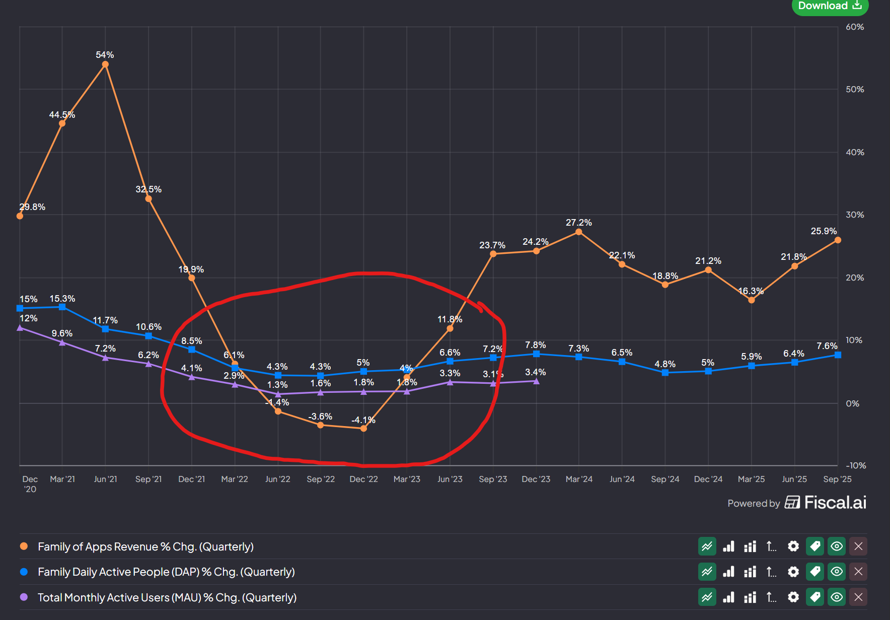 Concurrently, TikTok was exploding in growth while Meta’s engagement briefly plateaued as e-commerce activity normalized after the pandemic surge (see red-circled diagram below).